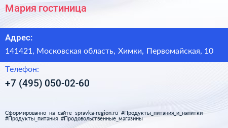 Мария, гостиница по адресу 141421, Московская область, Химки, Первомайская, 10 в дальнейшем Организация, размещена в следующих категориях: