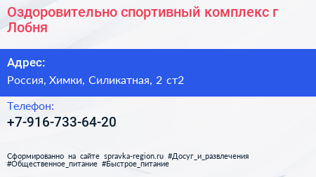 Оздоровительно-спортивный комплекс г. Лобня по адресу Оздоровительно-спортивный комплекс г. Лобня, 2 с2, Силикатная улица, Москвич, Южный, Лобня, Московская область, Центральный федеральный округ, 141730, Россия в дальнейшем Организация, размещена в следующих категориях: