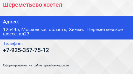 Шереметьево, хостел по адресу 125445, Московская область, Химки, Шереметьевское шоссе, вл23 в дальнейшем Организация, размещена в следующих категориях: