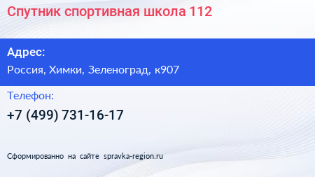 Спутник, спортивная школа №112 по адресу Спортивная школа № 112 Спутник, к907, Каштановая аллея ветеранов, 9-й микрорайон, район Старое Крюково, Зеленоград, Москва, Центральный федеральный округ, 124527, Россия в дальнейшем Организация, размещена в следующих категориях: