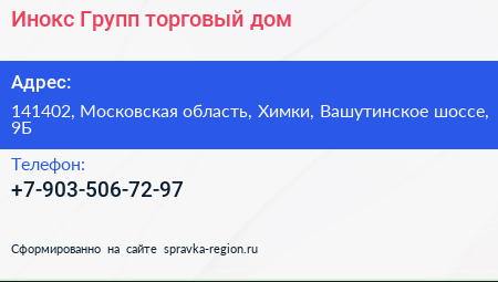Инокс-Групп, торговый дом по адресу 141402, Московская область, Химки, Вашутинское шоссе, 9Б в дальнейшем Организация, размещена в следующих категориях: