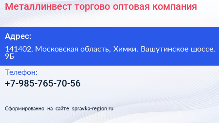 Металлинвест, торгово-оптовая компания по адресу 141402, Московская область, Химки, Вашутинское шоссе, 9Б в дальнейшем Организация, размещена в следующих категориях: