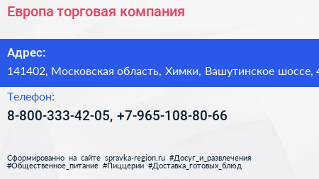 Европа, торговая компания по адресу 141402, Московская область, Химки, Вашутинское шоссе, 4 в дальнейшем Организация, размещена в следующих категориях: