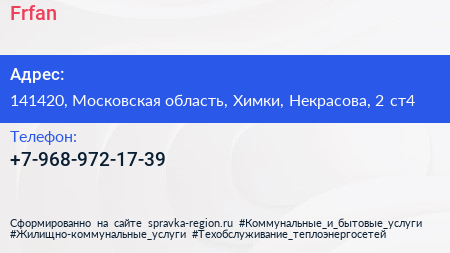 Frfan по адресу 141420, Московская область, Химки, Некрасова, 2 ст4 в дальнейшем Организация, размещена в следующих категориях: