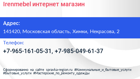 Irenmebel, интернет-магазин по адресу 141420, Московская область, Химки, Некрасова, 2 в дальнейшем Организация, размещена в следующих категориях: