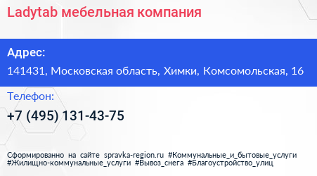 Ladytab, мебельная компания по адресу 141431, Московская область, Химки, Комсомольская, 16 в дальнейшем Организация, размещена в следующих категориях: