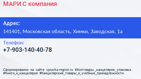 МАРИ-С, компания по адресу 141401, Московская область, Химки, Заводская, 1а в дальнейшем Организация, размещена в следующих категориях: