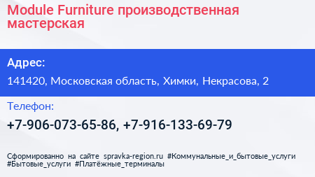 Module Furniture, производственная мастерская по адресу 141420, Московская область, Химки, Некрасова, 2 в дальнейшем Организация, размещена в следующих категориях: