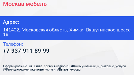 Москва мебель по адресу 141402, Московская область, Химки, Вашутинское шоссе, 18 в дальнейшем Организация, размещена в следующих категориях: