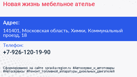 Новая жизнь, мебельное ателье по адресу 141401, Московская область, Химки, Коммунальный проезд, 18 в дальнейшем Организация, размещена в следующих категориях: