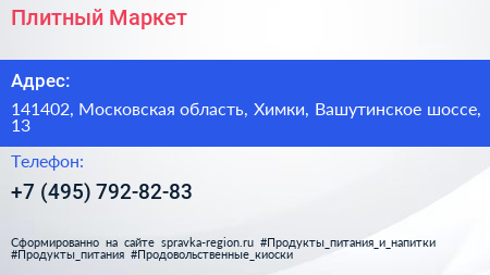 Плитный Маркет по адресу 141402, Московская область, Химки, Вашутинское шоссе, 13 в дальнейшем Организация, размещена в следующих категориях: