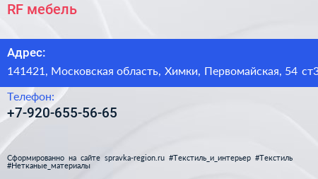 RF мебель по адресу 141421, Московская область, Химки, Первомайская, 54 ст3 в дальнейшем Организация, размещена в следующих категориях: