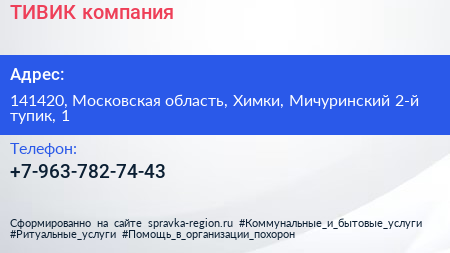 ТИВИК, компания по адресу 141420, Московская область, Химки, Мичуринский 2-й тупик, 1 в дальнейшем Организация, размещена в следующих категориях: