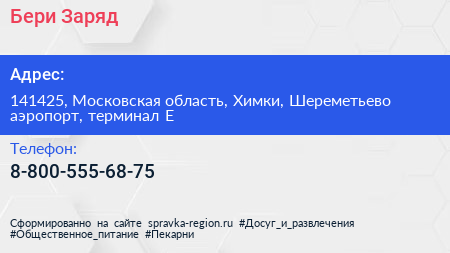 Бери Заряд! по адресу 141425, Московская область, Химки, Шереметьево аэропорт, терминал E в дальнейшем Организация, размещена в следующих категориях: