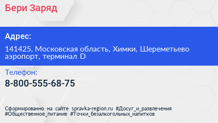 Бери Заряд! по адресу 141425, Московская область, Химки, Шереметьево аэропорт, терминал D в дальнейшем Организация, размещена в следующих категориях: