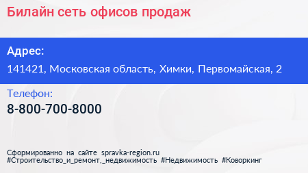 Билайн, сеть офисов продаж по адресу 141421, Московская область, Химки, Первомайская, 2 в дальнейшем Организация, размещена в следующих категориях: