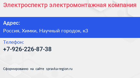 Электроспектр, электромонтажная компания по адресу Старый корпус ФНЦ ВИК имени В.Р. Вильямса, к3, улица Научный Городок, Луговая, городской округ Лобня, Московская область, Центральный федеральный округ, 141730, Россия в дальнейшем Организация, размещена в следующих категориях: