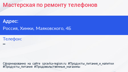 Мастерская по ремонту телефонов по адресу Компания по оптовым продажам металлопроката и металлообработке, 4Б, улица Маяковского, Москвич, Депо, городской округ Лобня, Московская область, Центральный федеральный округ, 141731, Россия в дальнейшем Организация, размещена в следующих категориях: