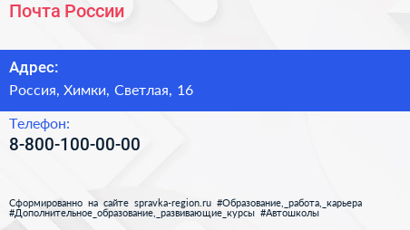 Почта России по адресу Администрация сельского поселения Федоскинское, 16, Светлая улица, Красная Горка, городской округ Мытищи, Московская область, Центральный федеральный округ, 141051, Россия в дальнейшем Организация, размещена в следующих категориях: