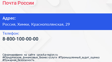 Почта России по адресу Отделение почтовой связи Лобня 141734, 29, Краснополянская улица, Красная Поляна, городской округ Лобня, Московская область, Центральный федеральный округ, 141734, Россия в дальнейшем Организация, размещена в следующих категориях: