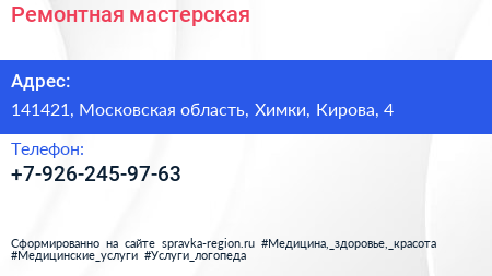 Ремонтная мастерская по адресу 141421, Московская область, Химки, Кирова, 4 в дальнейшем Организация, размещена в следующих категориях: