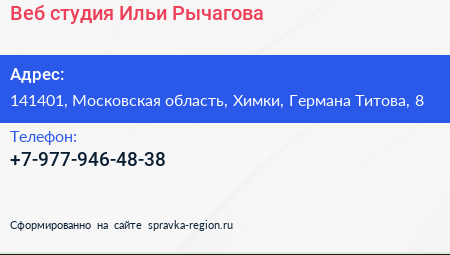 Веб-студия Ильи Рычагова по адресу 141401, Московская область, Химки, Германа Титова, 8 в дальнейшем Организация, размещена в следующих категориях: