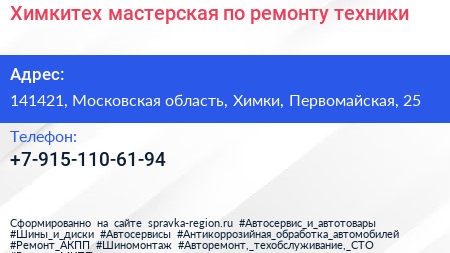 Химкитех, мастерская по ремонту техники по адресу 141421, Московская область, Химки, Первомайская, 25 в дальнейшем Организация, размещена в следующих категориях: