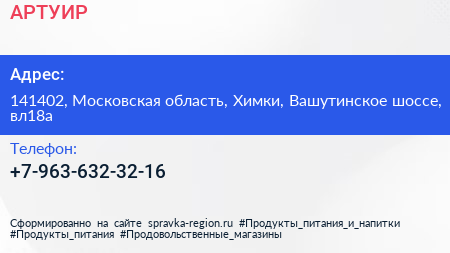 АРТУИР по адресу 141402, Московская область, Химки, Вашутинское шоссе, вл18а в дальнейшем Организация, размещена в следующих категориях: