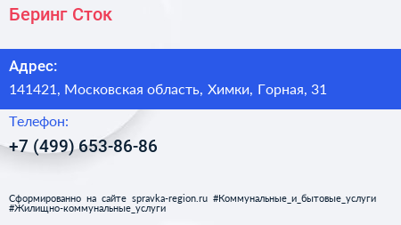 Беринг Сток по адресу 141421, Московская область, Химки, Горная, 31 в дальнейшем Организация, размещена в следующих категориях: