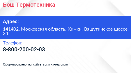Бош Термотехника по адресу 141402, Московская область, Химки, Вашутинское шоссе, 24 в дальнейшем Организация, размещена в следующих категориях: