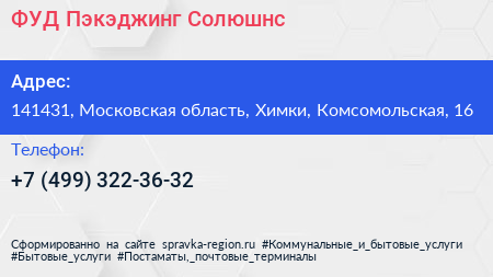 ФУД Пэкэджинг Солюшнс по адресу 141431, Московская область, Химки, Комсомольская, 16 в дальнейшем Организация, размещена в следующих категориях: