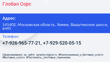 Глобал Сорс по адресу 141402, Московская область, Химки, Вашутинское шоссе, вл45 в дальнейшем Организация, размещена в следующих категориях: