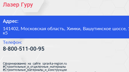 Лазер Гуру по адресу 141402, Московская область, Химки, Вашутинское шоссе, 1 к5 в дальнейшем Организация, размещена в следующих категориях: