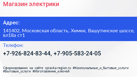 Магазин электрики по адресу 141402, Московская область, Химки, Вашутинское шоссе, вл18а ст1 в дальнейшем Организация, размещена в следующих категориях: