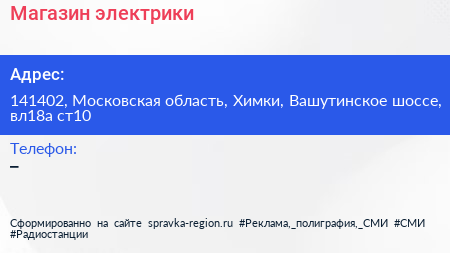 Магазин электрики по адресу 141402, Московская область, Химки, Вашутинское шоссе, вл18а ст10 в дальнейшем Организация, размещена в следующих категориях: