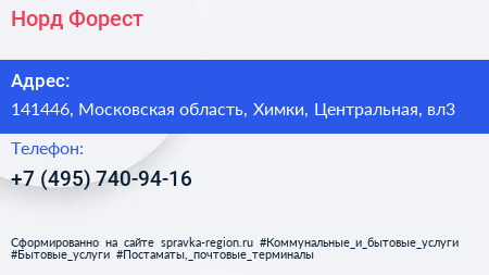 Норд Форест по адресу 141446, Московская область, Химки, Центральная, вл3 в дальнейшем Организация, размещена в следующих категориях: