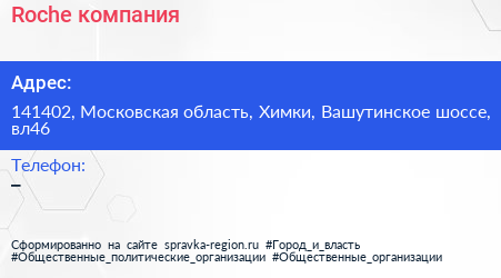 Roche, компания по адресу 141402, Московская область, Химки, Вашутинское шоссе, вл46 в дальнейшем Организация, размещена в следующих категориях:
