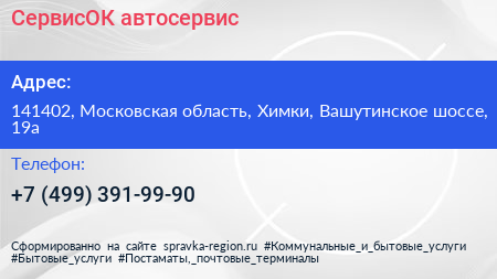 СервисОК, автосервис по адресу 141402, Московская область, Химки, Вашутинское шоссе, 19а в дальнейшем Организация, размещена в следующих категориях: