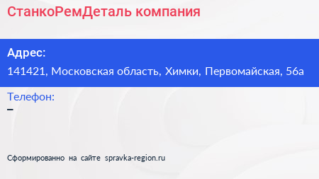 СтанкоРемДеталь, компания по адресу 141421, Московская область, Химки, Первомайская, 56а в дальнейшем Организация, размещена в следующих категориях: