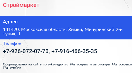 Строймаркет по адресу 141420, Московская область, Химки, Мичуринский 2-й тупик, 1 в дальнейшем Организация, размещена в следующих категориях: