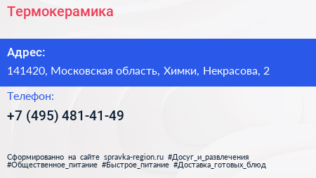 Термокерамика по адресу 141420, Московская область, Химки, Некрасова, 2 в дальнейшем Организация, размещена в следующих категориях: