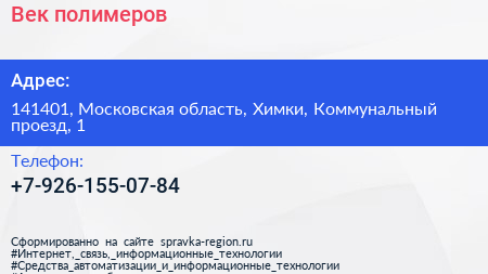 Век полимеров по адресу 141401, Московская область, Химки, Коммунальный проезд, 1 в дальнейшем Организация, размещена в следующих категориях:
