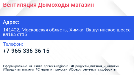 Вентиляция & Дымоходы, магазин по адресу 141402, Московская область, Химки, Вашутинское шоссе, вл18а ст15 в дальнейшем Организация, размещена в следующих категориях: