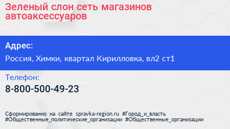 Зеленый слон, сеть магазинов автоаксессуаров по адресу ТЦ Ленинградка, 2, Ленинградское шоссе, Черкизово, Молжаниновский район, Новоподрезково, Химки, городской округ Химки, Московская область, Центральный федеральный округ, 141436, Россия в дальнейшем Организация, размещена в следующих категориях: