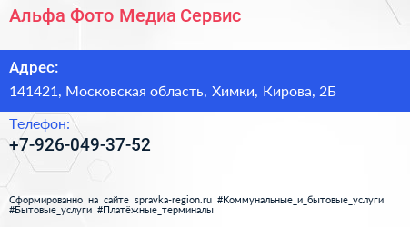 Альфа Фото Медиа Сервис по адресу 141421, Московская область, Химки, Кирова, 2Б в дальнейшем Организация, размещена в следующих категориях: