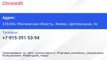 Chronedit по адресу 141446, Московская область, Химки, Центральная, 4а в дальнейшем Организация, размещена в следующих категориях: