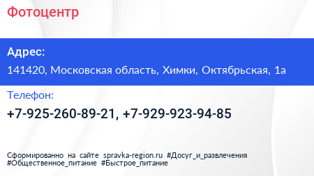 Фотоцентр по адресу 141420, Московская область, Химки, Октябрьская, 1а в дальнейшем Организация, размещена в следующих категориях: