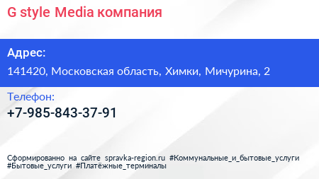 G-style Media, компания по адресу 141420, Московская область, Химки, Мичурина, 2 в дальнейшем Организация, размещена в следующих категориях: