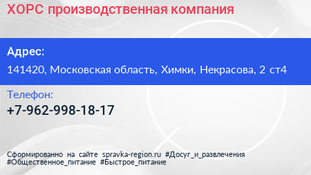 ХОРС, производственная компания по адресу 141420, Московская область, Химки, Некрасова, 2 ст4 в дальнейшем Организация, размещена в следующих категориях: