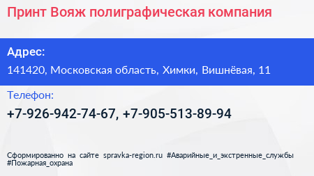 Принт-Вояж, полиграфическая компания по адресу 141420, Московская область, Химки, Вишнёвая, 11 в дальнейшем Организация, размещена в следующих категориях: